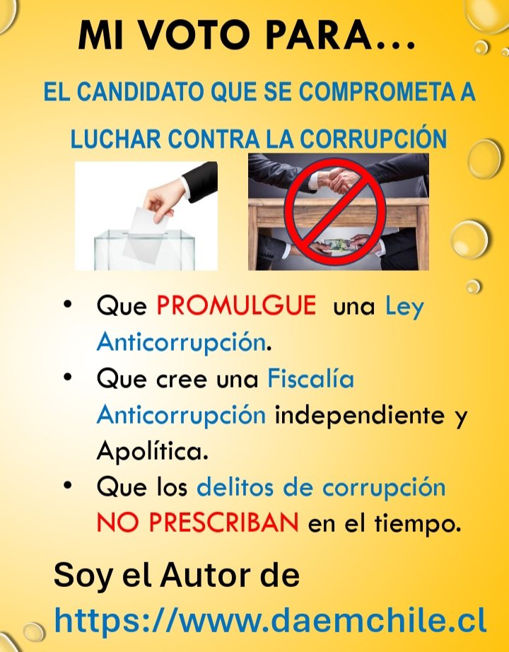 Ad Portas de una próxima Elección Presidencial, se ha constatado que ningún candidato presidencial ha considerado incluir una propuesta seria contra la Corrupción. En Octubre de 2019, la ciudadanía de izquierda y derecha se unió en una manifestación multitudinaria, para protestar por la corrupción política existente.